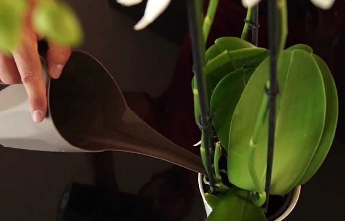 Корневую подкормку используют в отношении здоровых растений. Предварительно обильно смачивают субстрат. В емкости с мягкой очищенной водой комнатной температуры разводят удобрение. Далее горшок с орхидеей опускают в питательный раствор на 15 минут. Чтобы хорошо смочить земляной ком, можно полить цветок под корень. Главное условие — проследить, чтобы жидкость полностью стекла, а не осталась в поддоне.