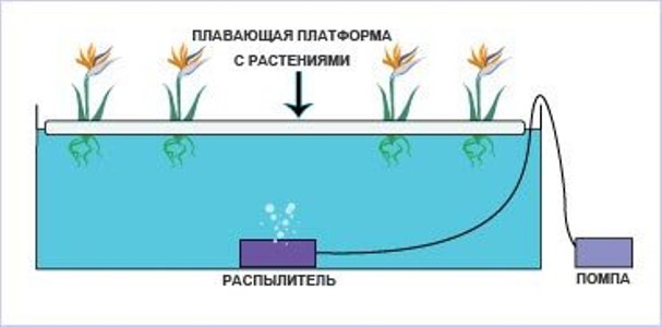Плавающая платформа. Горшки с рассадой фиксируются на платформе с прорезями. Последняя устанавливается на емкости с водой. Корневая система самостоятельно всасывает необходимый объем жидкости.